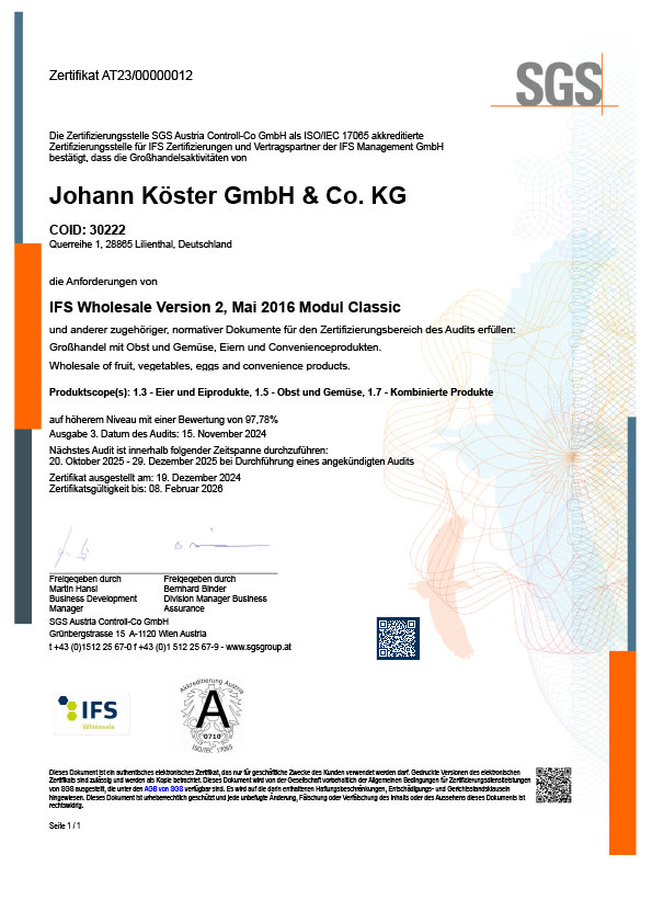 Im Jahr 1937 erhielt Firmengründer Johann Köster die Zulassung für den Kartoffelhandel. Schnell wurde ihm klar, dieser allein reicht nicht aus. Die ersten Erweiterungen verwarf jedoch der zweite Weltkrieg. 1947 konnte Johann jedoch das Geplante in die Tat umsetzen und das Unternehmen vertrieb fortan auch Obst und Gemüse. Dabei arbeitete er schon damals mit vielen Landwirten der Region zusammen. Diese lieferten u.a. Kartoffeln, welche dann im eigenen Packbetrieb für den Weiterverkauf abgepackt wurden. Weil noch immer der zweite Weltkrieg seine Spuren hinterließ, wollte Johann Köster helfen und nahm 1951 Kohle als Brennstoff mit ins Programm auf. Heizöl sollte später diesen als Heizprodukt ablösen. So erklärt sich auch heute noch der Zusammenhang zweier Sparten im Unternehmen der Johann Köster GmbH & Co. KG. Nachdem zunächst Johanns Söhne Heinrich und Joachim die Firma übernahmen, stieg 1988 Heinrichs Sohn Detlev in die Firma ein, 1995 übernahm er in dritter Generation das Ruder als Geschäftsführer. Mit den Jahren erweiterte er das Unternehmen kontinuierlich. Anfang der 2000er-Jahre wurde das Betriebsgebäude komplett erneuert und mit modernen Kühlhäusern und vergrößerter Fläche neu errichtet. Um weitere Lagerfläche zu schaffen, gab er wenig später noch den Kartoffelabpackbetrieb auf und setzte eine weitere moderne Halle auf das Firmengrundstück. Der Kundenstamm wuchs bis heute stetig, wobei von Beginn an auf Vielschichtigkeit gesetzt wurde. Heute beliefern wir den Lebensmitteleinzelhandel, Gastronomie- und Hotellerie, Kantinen, Hochschulen, den C+C-Großhandel und andere Großverbraucher des gewerblichen Bedarfs. Dabei setzen wir auf den Direkteinkauf. Fast alle Waren erreichen unser Lager auf dem direkten Wege ohne Zwischenhandel.